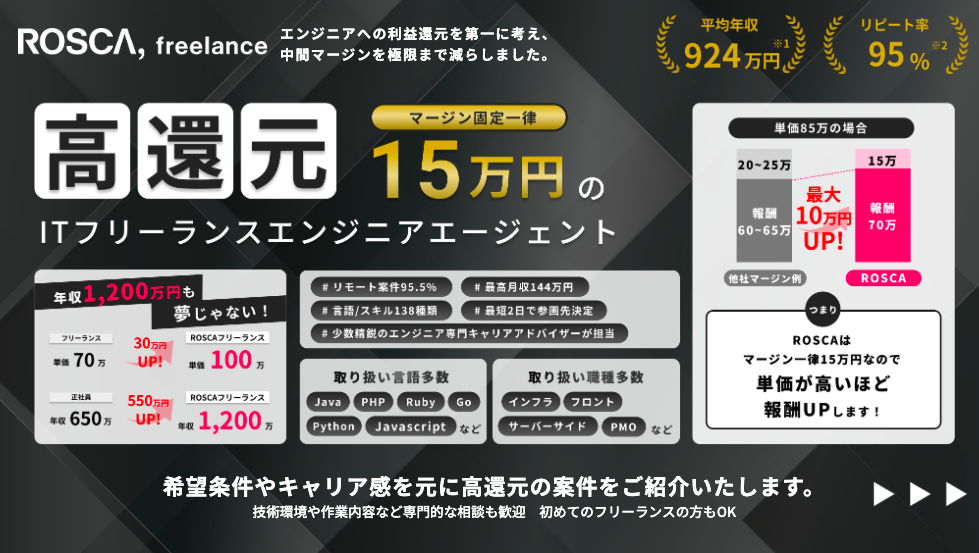 一方、ROSCA freelanceは固定マージン15万円という仕組みを採用しています。つまり、単価が高いエンジニアほど受け取れる金額が多くなるのが最大の特徴です。